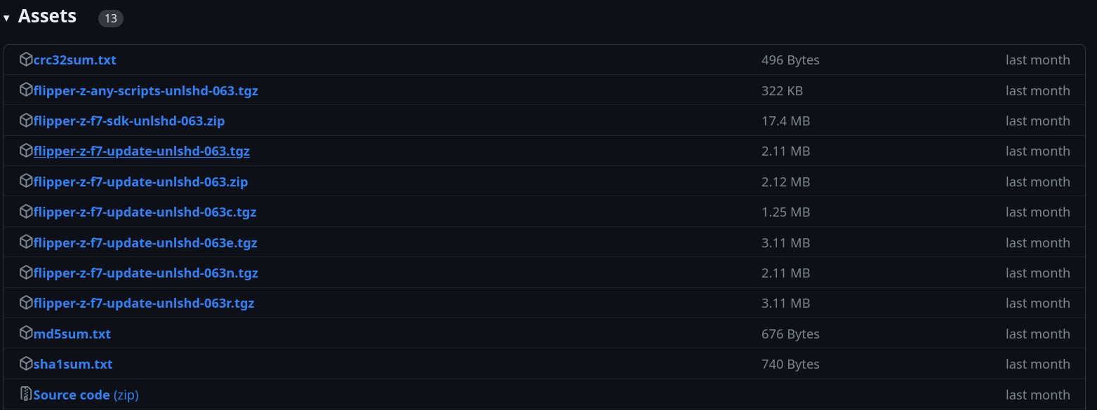 To get started, we need to download the firmware. In this case, I will use unleashed-firmware. I will download version flipper-z-f7-update-unlshd-063.tgz.